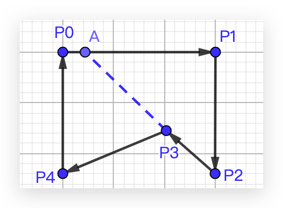 我们希望分割原坐标数组为 [p1, p2, A] 和 [p0, A, p3, p4] ,观察数组的点都是按照顺时针排列的,这个顺序很重要,一来可以确保多边形的形状,二来可以继续用我们上面的切割方法继续对剩下的多边形切割。